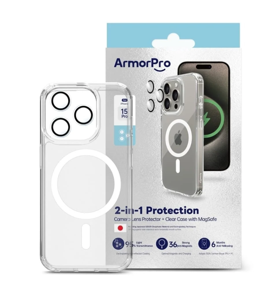 بكج كفر ماق سيف وعدسات شفاف ايفون 15 برو من ArmorPro
