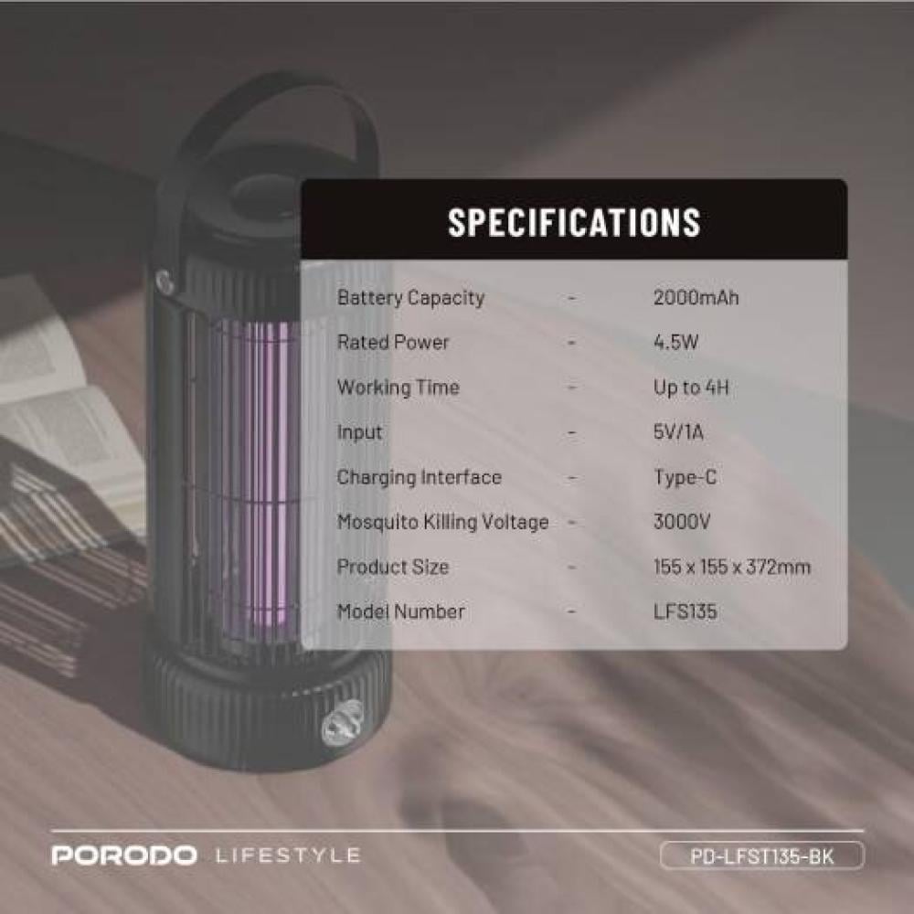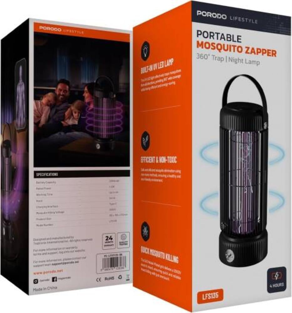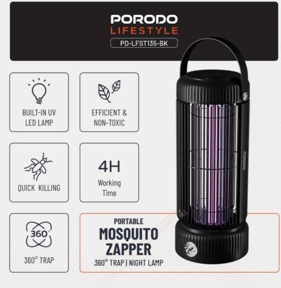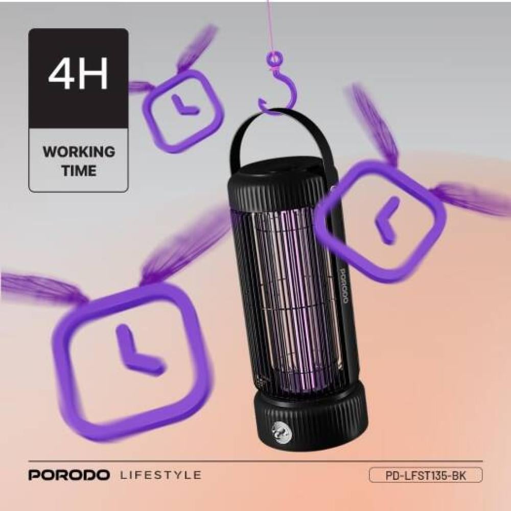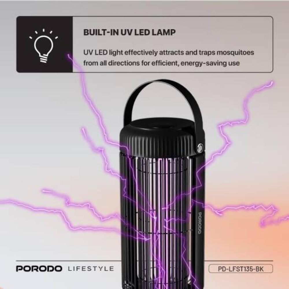 بورودو لايفستايل جهاز صاعق للبعوض محمول مع مصباح LED UV مدمج، حتى 4 ساعات من وقت العمل، سعة البطارية 2000 مللي أمبير، فعال وغير سام، طاقة مصنفة 4.5 واط - أسود