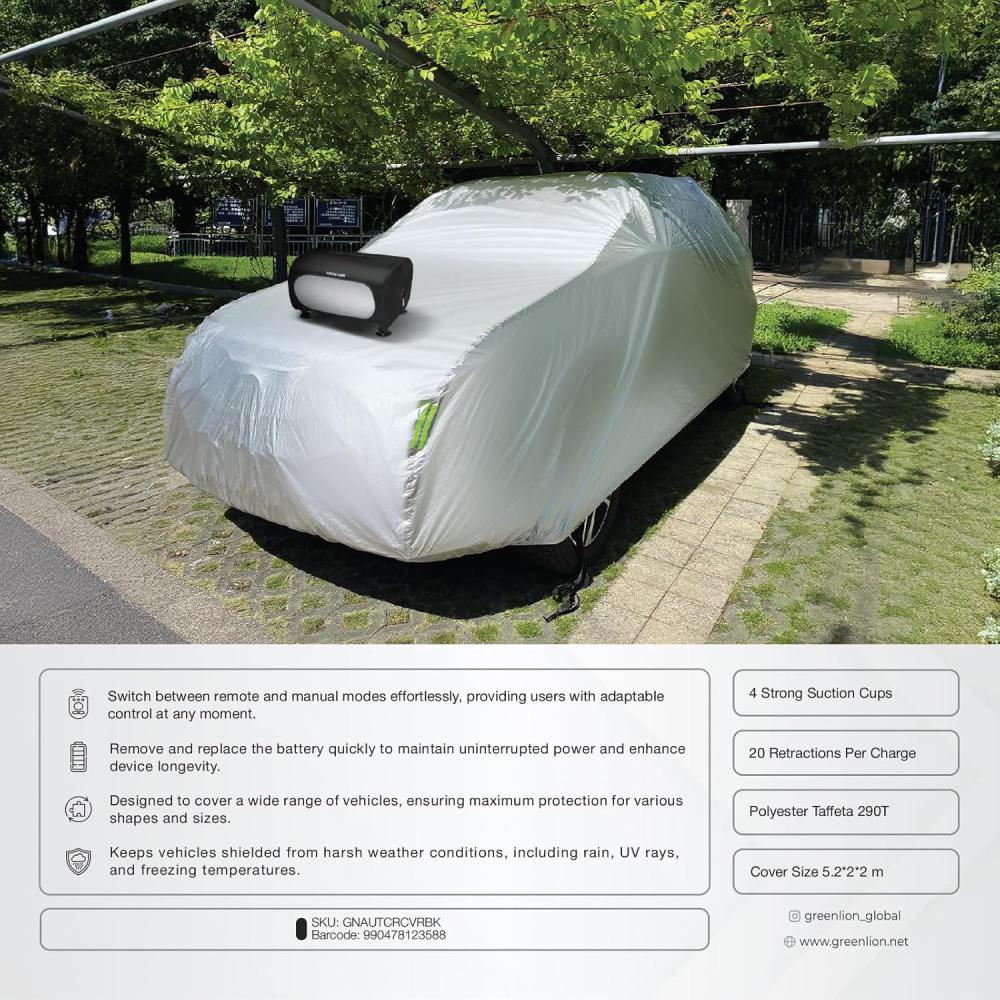 غطاء السيارة "جرين ليون" للتحكم عن بُعد هو حلٌّ تكنولوجيّ متطور يوفر حمايةً كاملةً لسيارتك. مصنوع من مادة ABS المتينة + Taffeta 190T، هذا الغطاء مقاومٌ للعوامل الجوية، ويحمي سيارتك من الغبار والمطر والأشعة فوق البنفسجية والخدوش. غطاء السيارة قابلٌ للتكيف عالميًا، ويناسب سيارات الهاتشباك والسيدان وسيارات الدفع الرباعي بمساحةٍ واسعة تبلغ 520×200×200 سم. يعمل الغطاء ببطارية قابلة للإزالة بسعة 1500 مللي أمبير/ساعة، ويعمل بقدرة 120 واط و12 فولت، مما يوفر انكماشًا سلسًا في غضون 10 ثوانٍ. إنه هادئ وفعال، بمستوى حماية 1000 باسكال ومستوى ضوضاء 50 ديسيبل فقط. يتوفر جهاز تحكم عن بُعد/يدوي لسهولة الاستخدام، وأربع أكواب شفط متينة توفر ملاءمةً محكمة. تكفي شحنة واحدة (من ساعتين إلى ثلاث ساعات) لتوفير ما يصل إلى 20 انكماشًا، وهو خيار عملي وموثوق لسائقي السيارات.