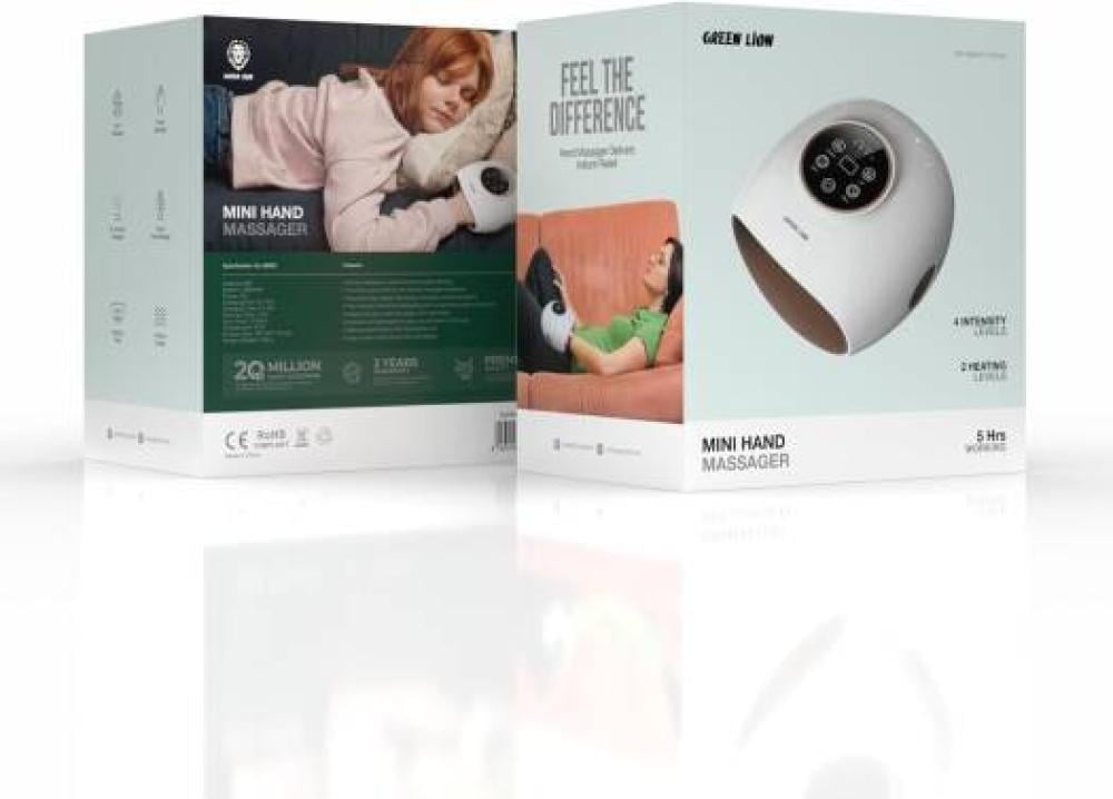 معلومات جهاز تدليك اليد الصغير من Green Lion، بطارية 2500 مللي أمبير، 4 مستويات شدة، مستويان للتسخين، مؤقت تلقائي، قابل للتعديل، تصميم منفصل للإصبع، محمول، للأيدي الباردة، آلام اليد، آلام الدورة الشهرية - أبي