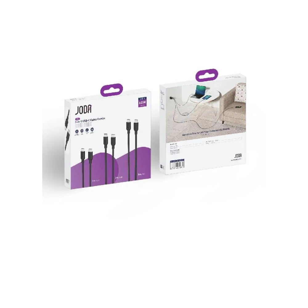 بكج مثالي من جودا يحتوي على 3 كيابل تايب سي بأطوال مختلفة (1 متر، 2 متر، 3 متر) بقوة شحن تصل إلى 60 واط. يوفر لك مرونة تامة لتوصيل أجهزتك من أي مكان في الغرفة سواء كنت قريب من المقبس أو بعيد عنه، مثالي لشحن الهواتف، التابلت، اللابتوبات وأي جهاز يدعم تايب سي.