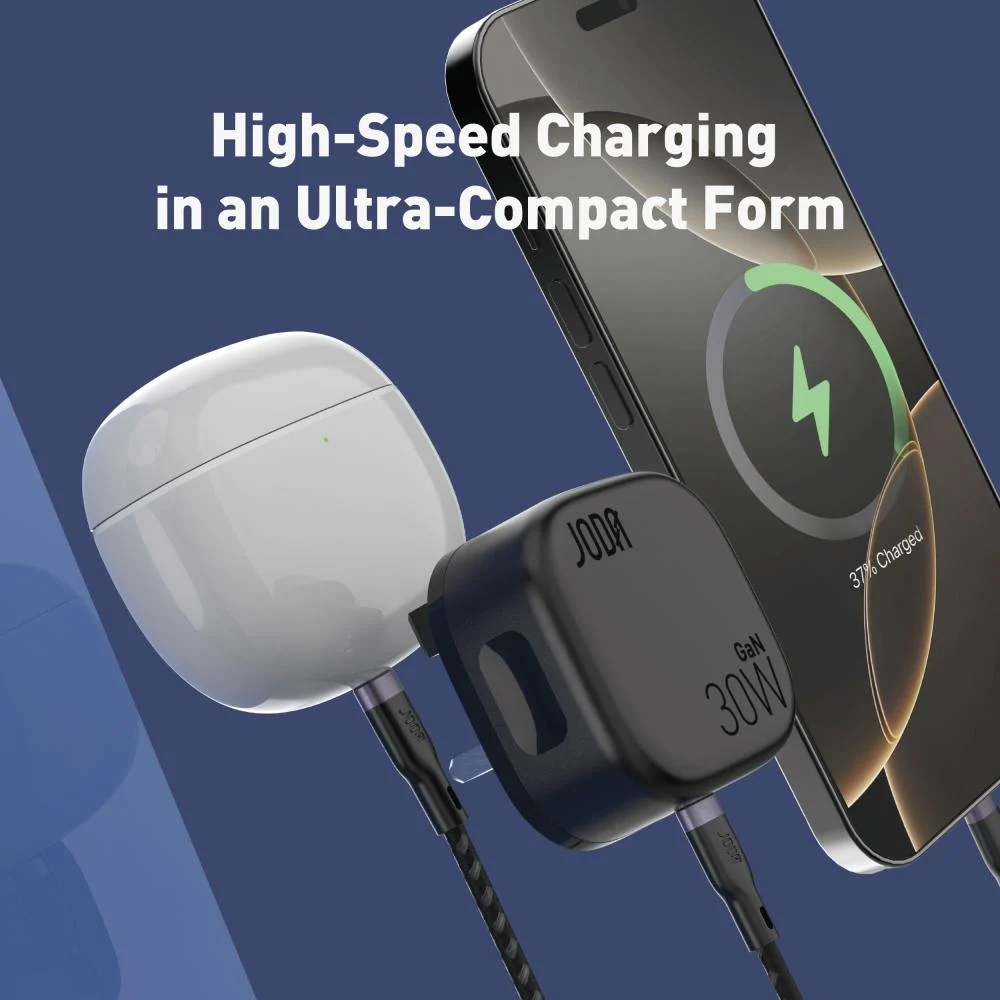 احصل على شحن سريع وفعّال مع شاحن JODA الجداري بتقنية GaN المتطورة. بقوة تصل إلى 45 واط، يأتي بتصميم فائق الصغر ووزن خفيف، ومزود بمنفذين Type-C لشحن جهازين في نفس الوقت دون التأثير على الأداء. مثالي للهواتف الذكية، الأجهزة اللوحية، وحتى الحواسيب المحمولة الصغيرة.