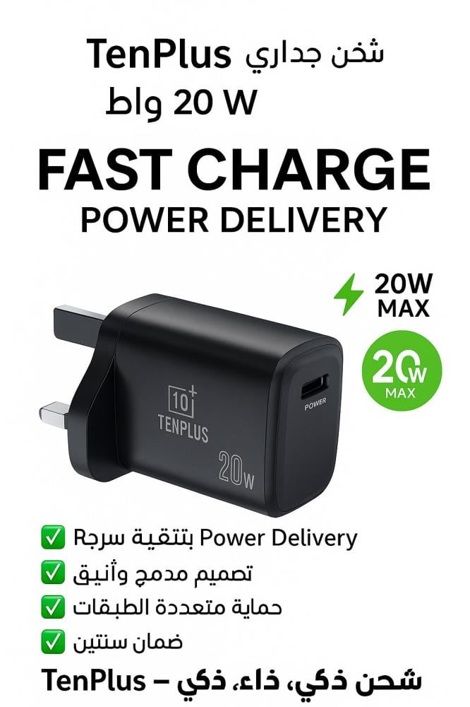 استمتع بشحن سريع وآمن مع شاحن TenPlus المعتمد بتقنية Power Delivery بقوة 20 واط. بفضل تصميمه المضغوط والمبتكر، يُعد الخيار المثالي لشحن الهواتف الذكية والأجهزة اللوحية بكفاءة عالية.