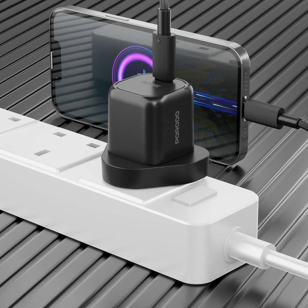 معلومات شاحن Porodo UK GaN مع كابل Type-C إلى Lightning Head، شحن سريع PD 20 وات، متوافق عالميًا، حماية من الحرارة الزائدة، شحن آمن وموثوق، خفيف الوزن وقابل للحمل | أسود