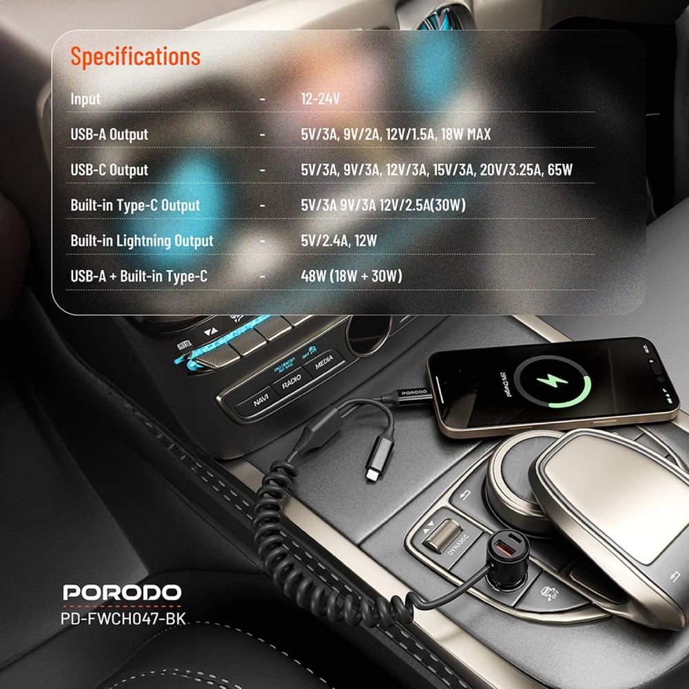 بفضل الميزات المنفَّذة بشكل مثالي، يستضيف شاحن السيارة Porodo 95 وات مصدر طاقة متكامل للحفاظ على تشغيل جميع أجهزتك أثناء التنقل. يتم تقديم الكفاءة والراحة لما يصل إلى أربعة مخرجات مختلفة بعدة طرق، مثل USB-C وUSB-A وموصلات Type-C ثنائية الاتجاه وموصلات الإضاءة. مزود بمخرج USB-C يصل إلى 65 وات ومخرج Type-C مدمج بقوة 30 وات، سيضمن الشاحن شحن هاتفك الذكي أو جهازك اللوحي أو حتى الكمبيوتر المحمول بأسرع ما يمكن. يوفر منفذ USB-A ما يصل إلى 18 وات، وهو مثالي للأجهزة الأخرى. الشحن المتزامن ممكن بسهولة، ويدعم مجموعات مثل USB-C + كابل Type-C بإجمالي 95 وات. تم دمج هذا الشاحن مع كابلات ملفوفة بنابض بطول 1.5 متر من أجل المرونة والمتانة. يضمن التوافق العالمي الشحن دون إزعاج بين مجموعة كبيرة ومتنوعة من الأجهزة. تم تصميمه ليناسب أي مركبة بمدخل 12-24 فولت، وسيكون مثاليًا، ويوفر طاقة موثوقة مع سرعة وكفاءة عالية للغاية.