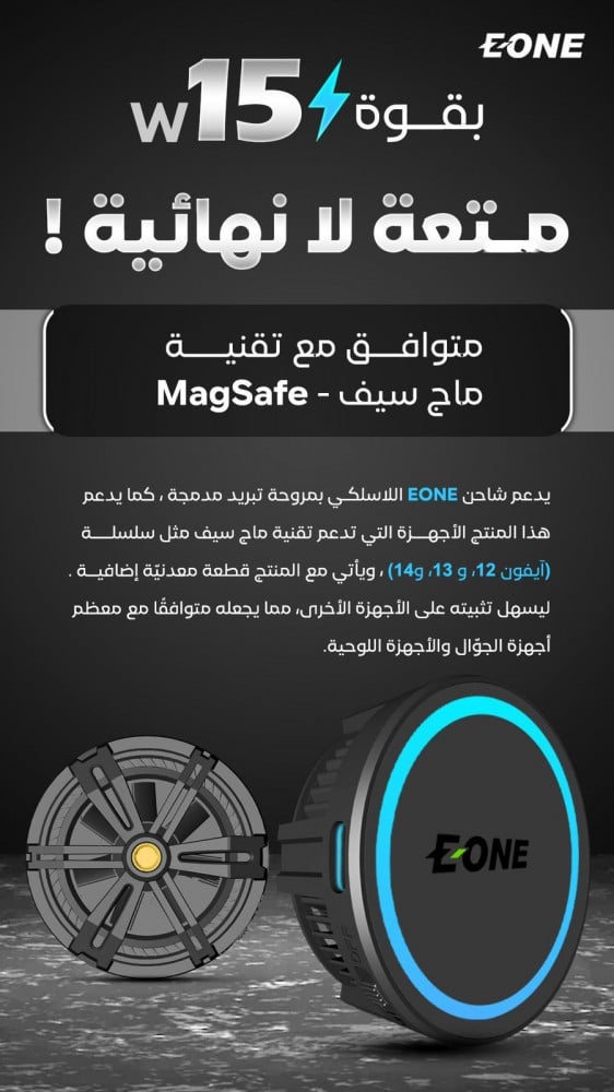 شاحن لاسلكي بقوة 15 واط مع مروحة تبرید مدمجة؛ متوافق مع تقنیة ماج سیف. ویدعم ھذا المنتج الأجھزة التي تدعم تقنیة ماج سیف مثل سلسلة )آیفون 12، و 13، و14(؛ ویأتي مع المنتج قطعة معدن ّیة إضافیة لیسھل تثبیتھ على الأجھزة الأخرى، مما یجعلھ متواف ًقا مع معظم أجھزة الج ّوال والأجھزة اللوحیة.