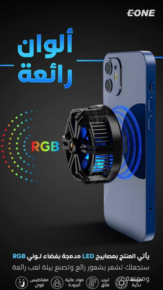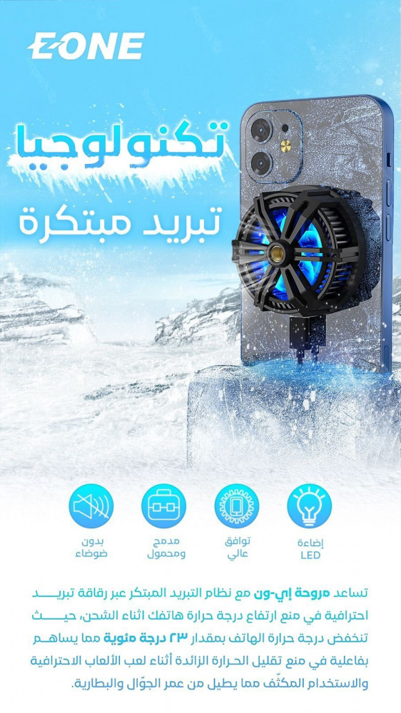 تساعد مروحة إي-ون مع نظام التبرید المبتكرعبر رقاقة تبرید احترافیة في منع ارتفاع درجة حرارة ھاتفك اثناء الشحن او الاستخدام. حیث یساھم بفاعلیة في منع تقلیل الحرارة الزائدة أثناء لعب الألعاب الاحترافیة والاستخدام المك ّثف، مما یطیل من عمر الج ّوال والبطاریة.