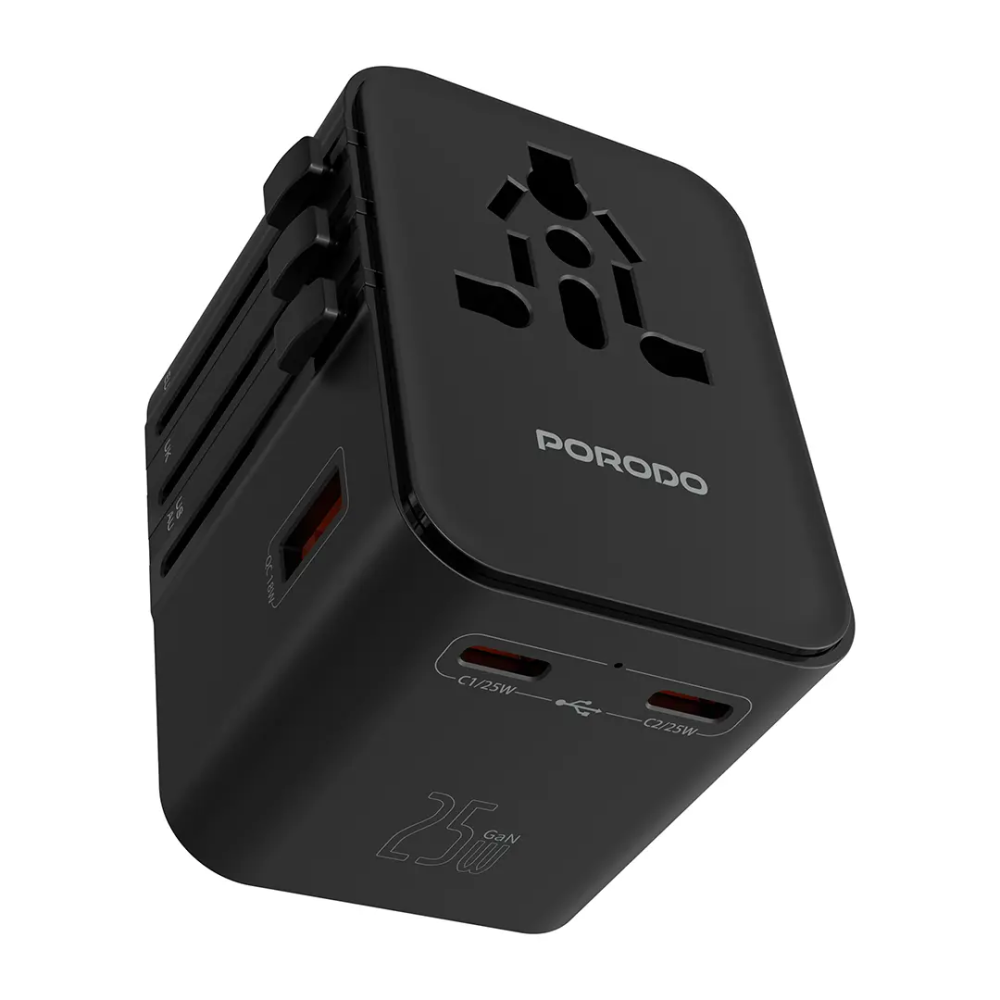 شاحن Porodo GaN العالمي السريع متعدد المنافذ للسفر هو منتج متخصص لشحن جميع أجهزتك الإلكترونية المختلفة وهو مصمم ليناسب حياة السفر العالمية. تسمح الطاقة المقدرة 2500 واط باستخدام الشاحن مع جميع أنواع المقابس تقريبًا من الولايات المتحدة الأمريكية والمملكة المتحدة والاتحاد الأوروبي وأستراليا. مزود بمنفذي USB-C ومنفذ USB-A واحد، يمكن للشاحن الشحن السريع بتقنيات مثل PD 25W و QC 18W لتوصيل طاقة جيد. تم تصنيف USB-C1 و USB-C2 بحد أقصى 18 واط مع خرج PPS في نطاق 3.3-11 فولت / 2.2 أمبير، بينما يمكن لمنفذ USB-A توفير شحن بحد أقصى 18 واط. تحمي الحماية الآمنة الخاصة به مع فتيل 10 أمبير وفتيل احتياطي أجهزتك من التيار الزائد أو ارتفاع درجة الحرارة. رفيق مثالي لأي مسافر، سيشحن هذا الشاحن الصغير كل أداة بسرعة بتقنية GaN لتقليل الحرارة وعمر أطول.