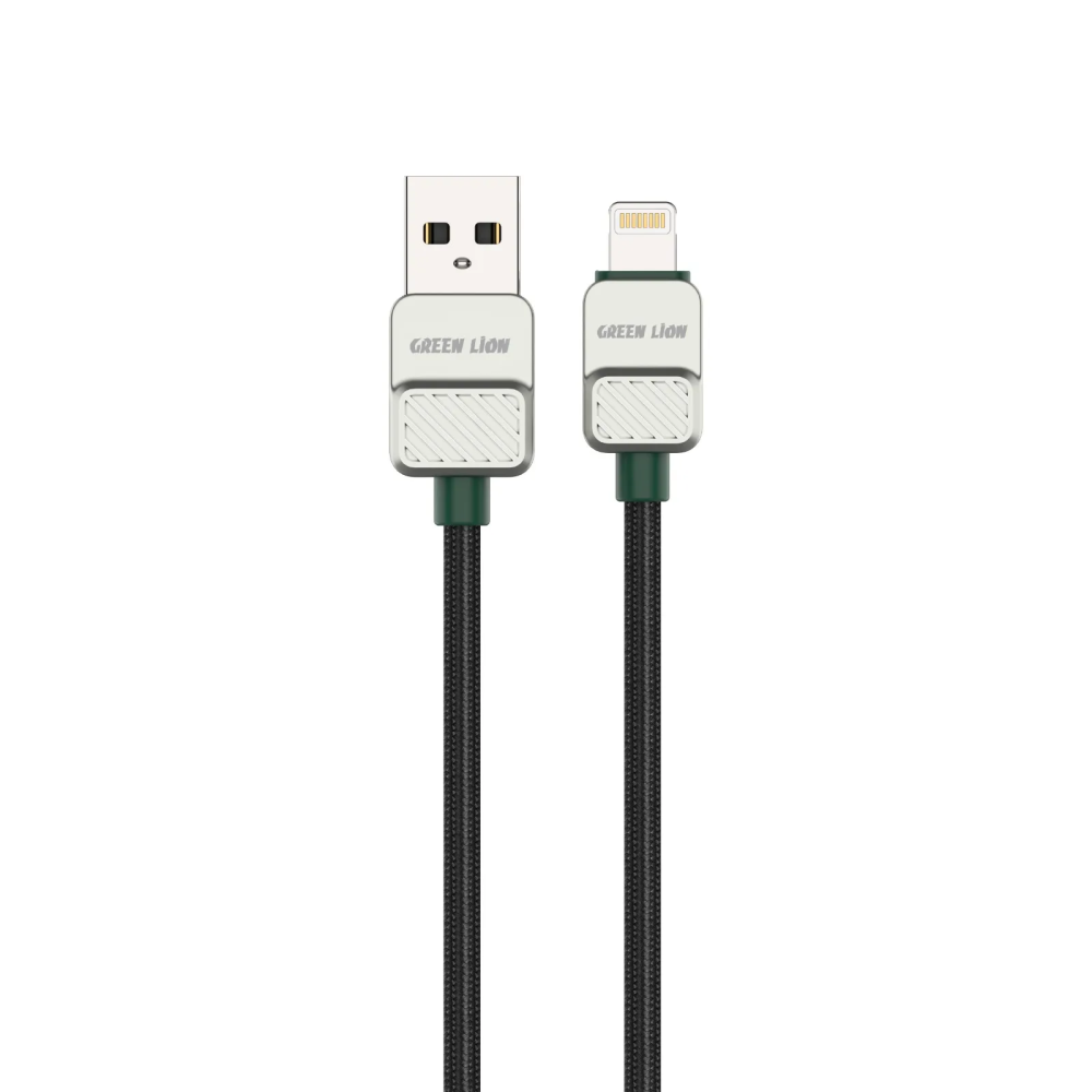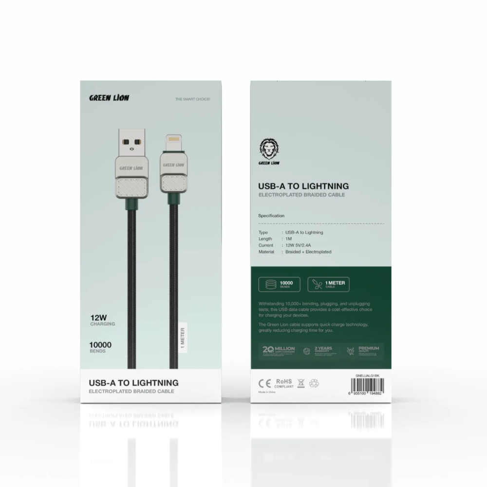 صمم كابل Green Lion USB A To Lightning Electroplated Braided Cable 1m 12w - Black+Green ليجمع بين القوة و الأناقة مع قدرة شحن تصل إلى 12 واط و بالإضافة لتصميم مضفر مطلي كهربائيا يمنحه مظهرا فخما و طبقة حماية إضافية