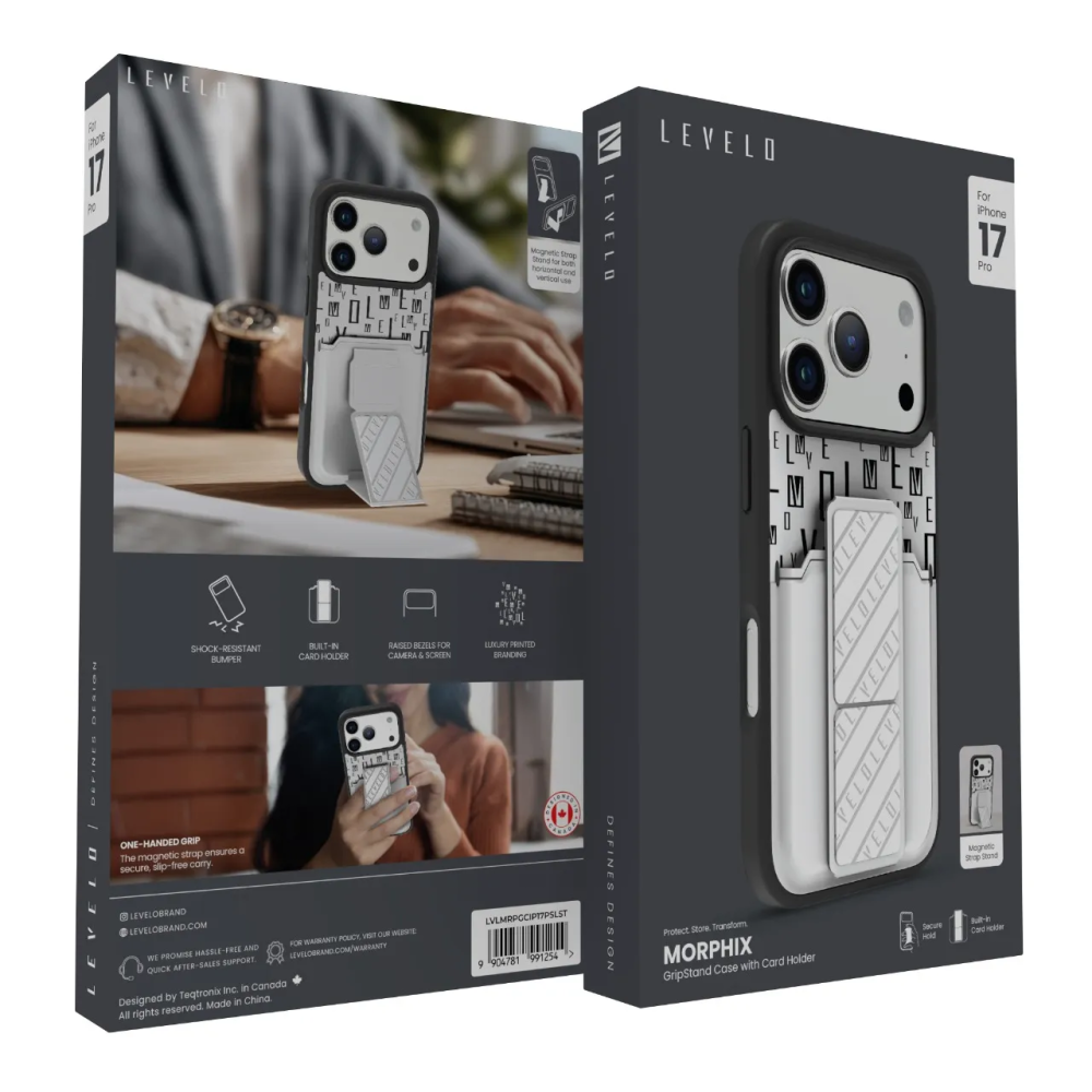 كفر جوال ايفون 17 مع مسكة وحامل بطاقات مورفيكس من ليفيلو لون فضي حجري