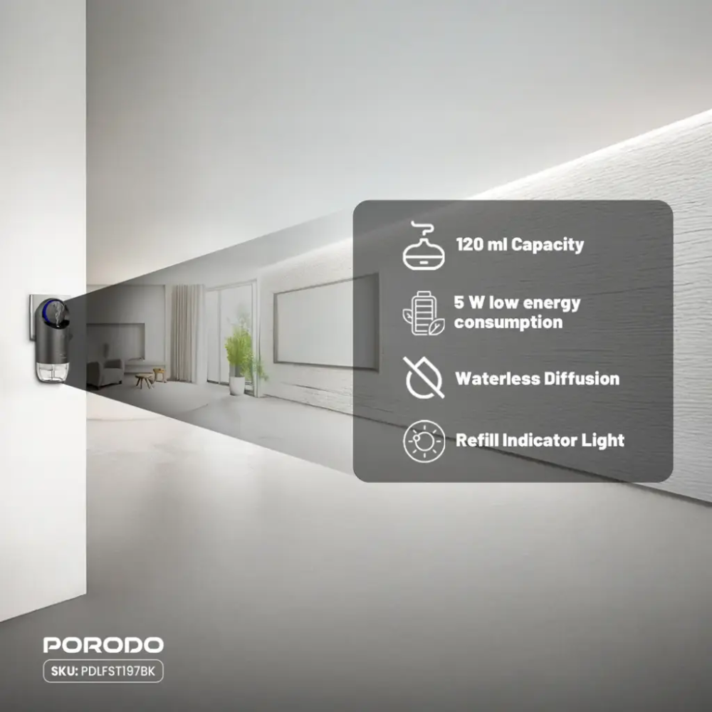 ناشر الزيوت العطرية الجداري "بورودو لايف ستايل" بسعة 120 مل، يُضفي هدوءًا على الغرف بمساحة تغطية تتراوح بين 200 و250 مترًا مكعبًا. بقدرة 5 واط فقط، يُعدّ حلاً موفرًا للطاقة، مثاليًا للاستخدام في غرفة المعيشة أو مكان العمل. يوفر الناشر فترات رذاذ مدتها 15 و30 و60 ثانية، مع مؤقت بضبط 60 و180 و360 ثانية، يمكن استخدامه حسب الرغبة. يضمن خيار التوزيع بدون ماء أقصى درجات السلامة والفعالية. يومض مؤشر إعادة التعبئة عند الحاجة إلى إعادة التعبئة بالزيت العطري. مزود بمقبس ثلاثي الأطراف من المملكة المتحدة، يُمكن استخدامه في أي مكان. تصميمه الانسيابي وخياراته القابلة للتعديل تُناسب تمامًا روتينك الصحي، حيث ينشر عطورًا مُهدئة، ويساعدك على الاسترخاء والتركيز طوال اليوم.